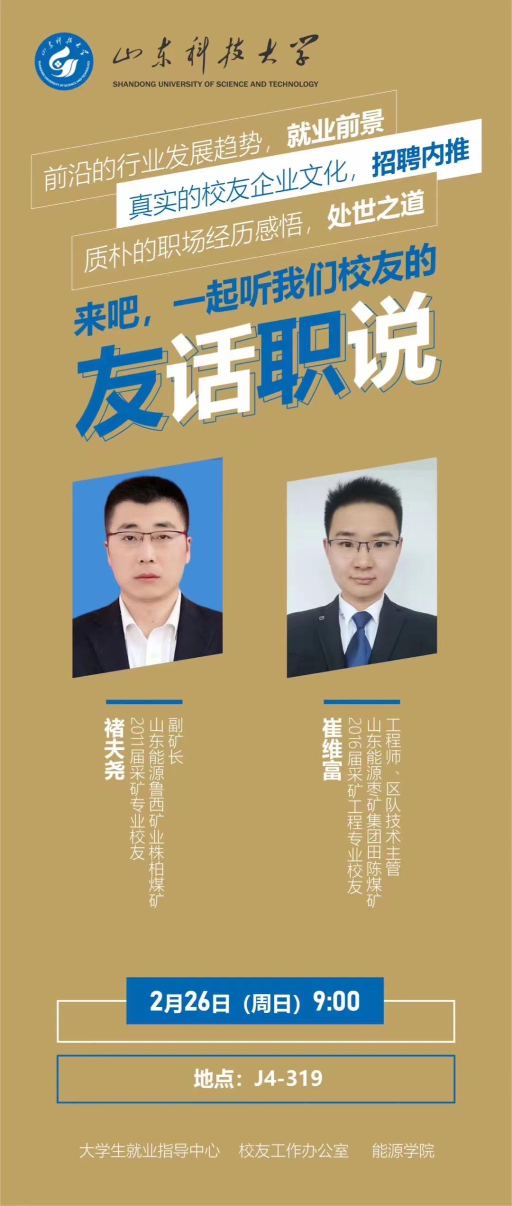 2月26日上午,h视频 举行“开学第一课”系列活动之“一缕春风,校友助启航”分享会,邀请山东能源集团鲁西矿业株柏煤矿副矿长、2011届采矿工程专业优秀校友褚夫尧,山东能源集团枣庄矿业田陈煤矿区队技术主管、2016届采矿工程专业优秀校友崔维富,助力广大同学规划大学生活和未来的职业生涯,深化校友指导帮扶毕业生就业工作实效。