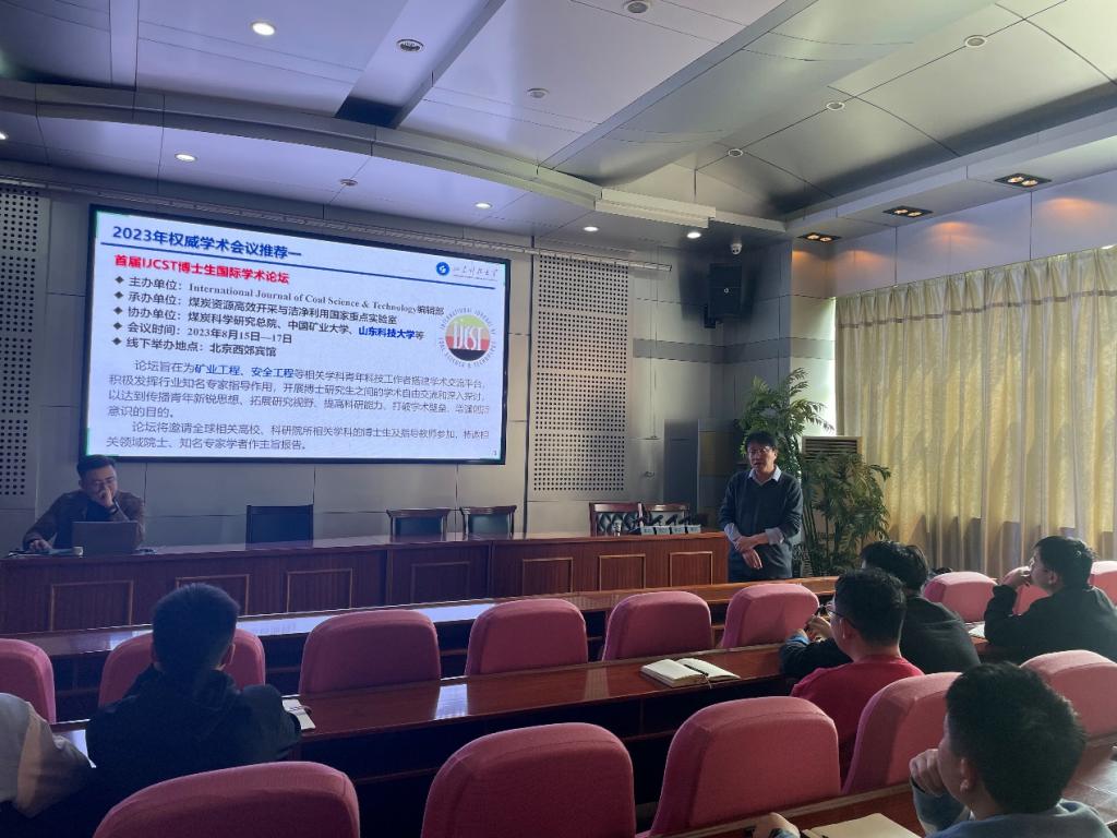 会上,赵同彬副院长对h视频研究生近年来参加学术交流情况进行了总结,从六个方面强调了研究生广泛参与学术活动的重要意义。赵院长指出,在读研究生参与学术交流活动有助于了解学术前沿、开拓学术思路、拓展学术资源、提高学术影响、积累学术经验、积攒学术成果,并鼓励在读研究生“走出去、讲出来”。h视频研究生管理办公室张鹏飞老师向全体参会人员推荐了“首届IJCST博士生国际学术论坛”、“第42届国际采矿岩层控制会议”、“第19届学生与青年学者国际论坛”等2023年矿业学科领域及相关学术组织计划举办的重要学术会议,并介绍了会议的具体情况,给出了博士研究生参会的指导意见。