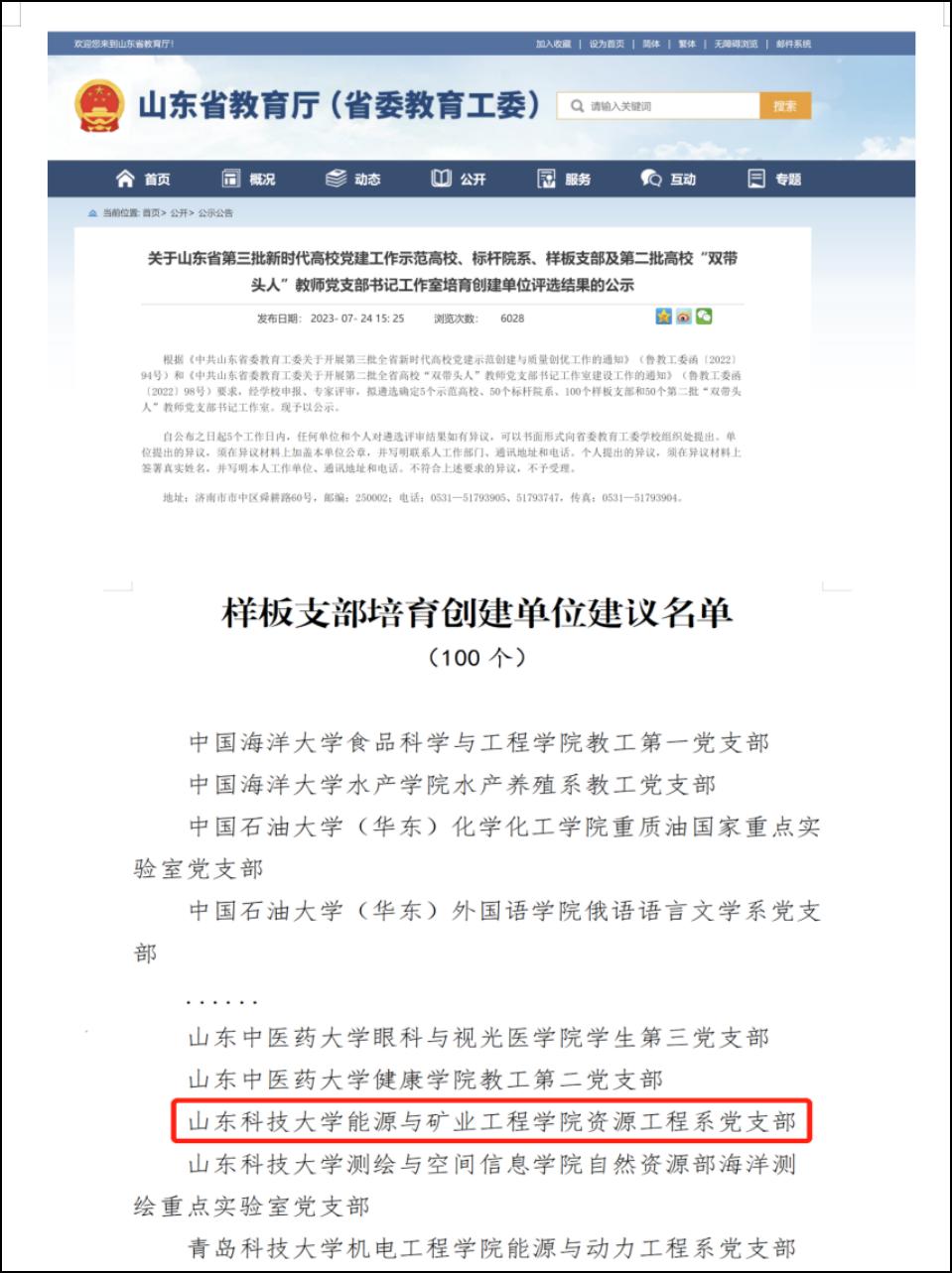 近日,中共山东省委教育工委发布《关于公布山东省第三批新时代高校党建工作示范高校、标杆院系、样板支部及第二批高校“双带头人”教师党支部书记工作室培育创建单位名单的通知》,h视频资源工程系党支部获评“样板支部”培育创建单位。