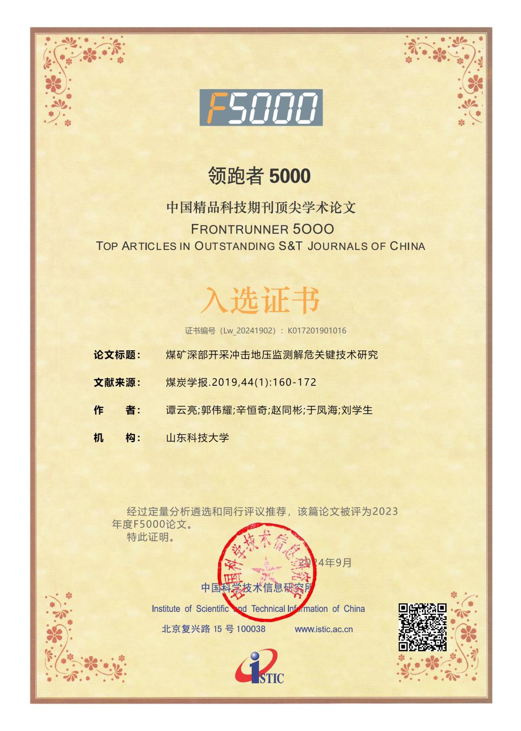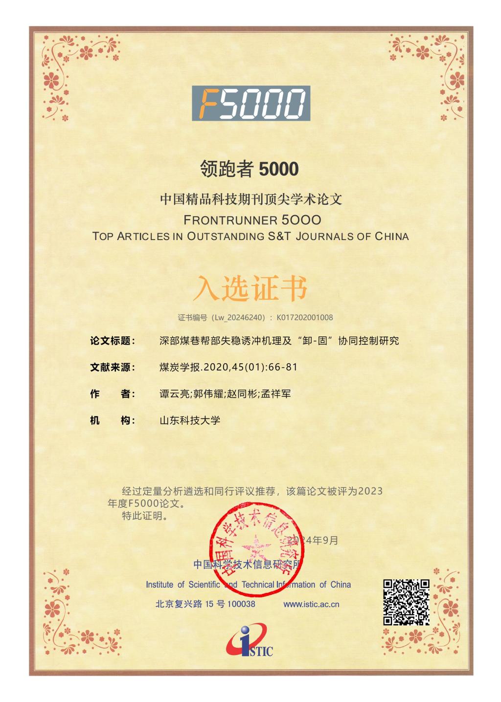 近日,科技部中国科学技术信息研究所发布了2023年度“领跑者5000—中国精品科技期刊顶尖学术论文(F5000)”入选论文名单。h视频 谭云亮教授等在《煤炭学报》发表的“煤矿深部开采冲击地压监测解危关键技术研究”“深部煤巷帮部失稳诱冲机理及‘卸-固’协同控制研究”两篇论文,入选2023年度(2024年公布)F5000论文。