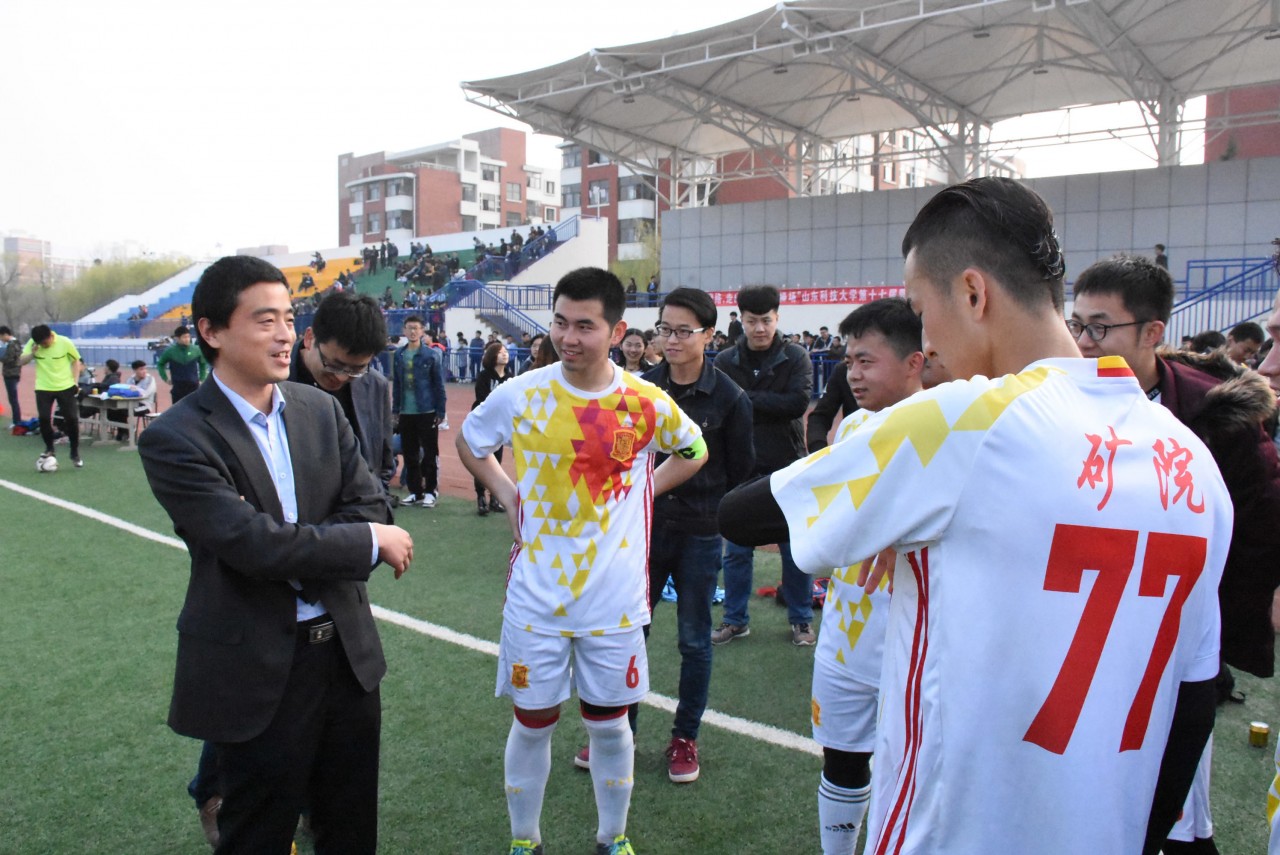 4月6日,第十七届学生男子足球赛迎来冠军争夺战,由矿业h视频足球队在风雨操场对阵土建h视频足球队。上半场双方平分秋色战成0:0,下半场读秒阶段,矿业h视频凭借14号王广宇的角球争顶,1:0绝杀土建h视频。矿业h视频党委书记梁赛江、党委副书记兼副院长穆玉兵、团委书记马鹤以及团委老师到场观看比赛。