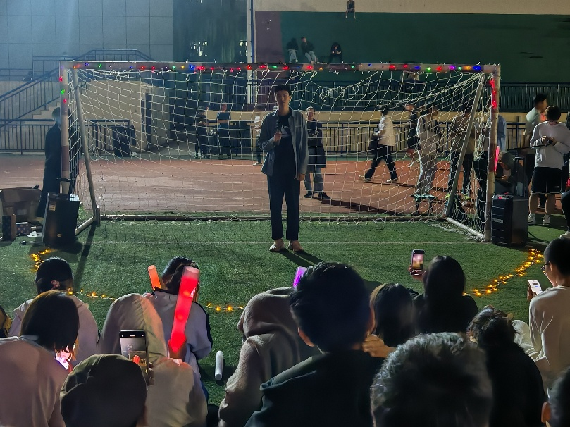 音乐节在《一点》的温柔旋律中拉开序幕,细腻唱腔勾勒出生活中微小而温暖的瞬间;《向阳而生》以充满力量的节奏,传递出能源学子面向未来、无惧挑战的勇气;一曲《老男孩》唤起对青春岁月的怀念,更激发新生珍惜当下、奋发作为的责任感;《落叶归根》深沉的嗓音则隐喻能源人扎根行业、奉献祖国的厚重情怀。中场游戏环节,马凌骥老师与新生热情互动,将现场气氛推向高潮。随后,《花海》的甜美歌声仿佛带领观众漫步春日花园,《SOLD OUT》的激昂旋律迸发出青春的蓬勃力量。最后,《ALWAYS ONLINE》的温情、《我知道》的细腻、《戒烟》的深情、《无名的人》的励志、《彩虹》的治愈,五首风格各异的歌曲接连上演,或温情脉脉打动人心,或励志昂扬鼓舞士气,每一首都赢得了新生们的热烈掌声与欢呼。