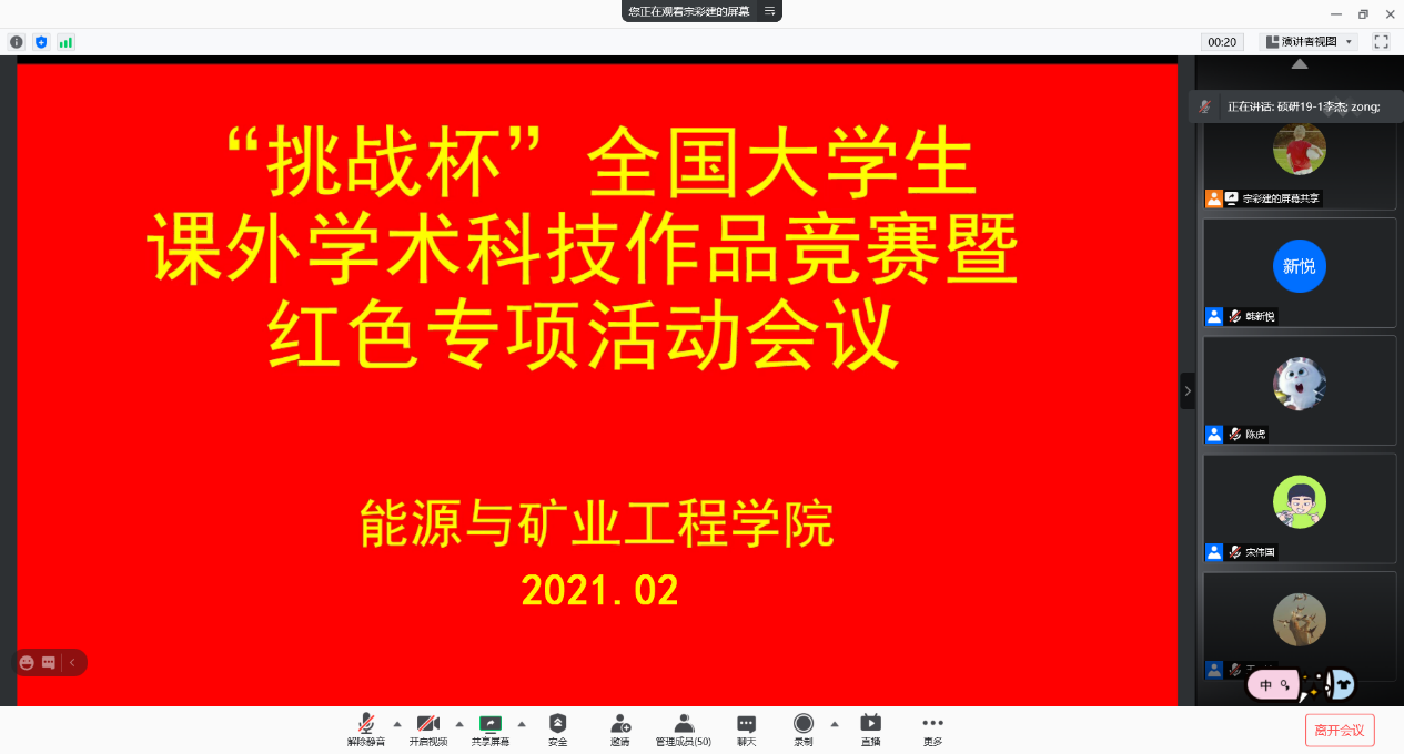 2月7日,h视频 “挑战杯”全国大学生课外学术科技作品竞赛暨红色专项推进会议在腾讯会议线上平台举行。会议邀请第十六届“挑战杯”全国大学生课外学术科技作品竞赛优秀项目代表宋伟国作为嘉宾,辅导员老师宗彩建、王振浩,科联成员以及各项目组成员参与会议。