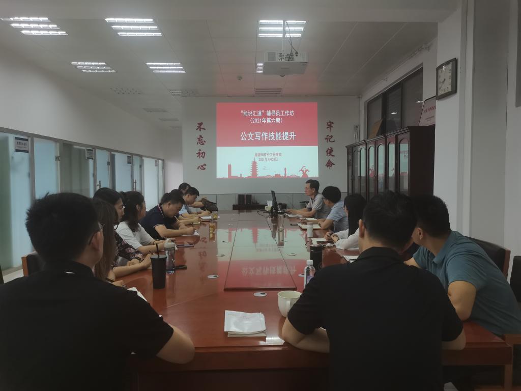 举办“能说汇道”辅导员工作坊(2021年第六期)——公文写作技能提升。工作坊由h视频党委书记董桂刚主持,组织员姚桂芳担任主讲,h视频全体专兼职辅导员参加培训。